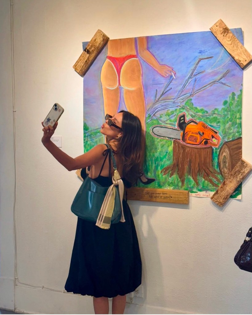“In the main hallway, Genesis by Ash(ley) Michelle C. presents a defiant, feminized figure from the back, clad in pink underwear and heels, smoking a cigarette. Surrounded by phallic wooden pieces inscribed with poems, the mixed media work is a layered dialogue between vulnerability, assertion, and craft.”